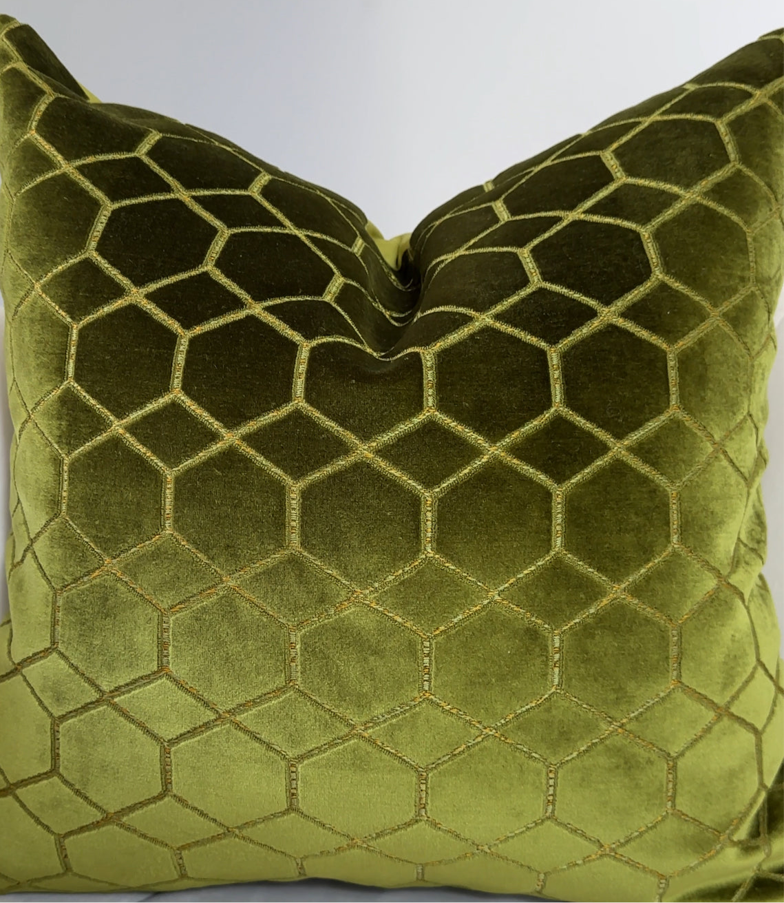 Infuse your home with a touch of luxury and vibrant color with this exquisite 22x22 velvet pillow cover. Featuring an elegant hexagonal pattern in a rich olive green, this cover adds depth and a modern touch to any space. The high-quality velvet material provides a soft, plush feel and a sophisticated sheen, making it an ideal accent piece for your living room, bedroom, or any area that needs a stylish update.
